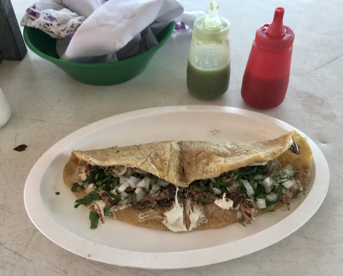 Gringa con tortilla de harina, queso oaxaca y chistorra.